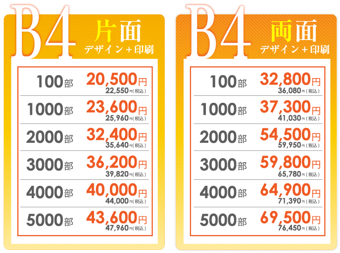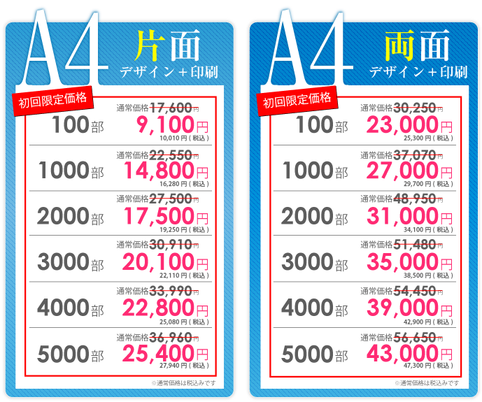 チラシデザイン作成、制作の強み 弊社の一番の強みは、低価格でハイクオリティーなチラシデザインの作成です。一般的な地元島根のデザイン会社ですと、チラシデザイン代片面で3万~4万が相場だと思います。 確かに安い業者はあるのですが、クオリティー的にプロとは言えないレベルのデザインの作成をし、一万円以下で販売もしている業者もいますが、対応のスピードや作品の質に疑問を感じます。島根チラシ作成.comではデザイナー全員が数年間の実務経験を経験しているデザイナーを多数抱えている為、低価格でのデザイン制作が可能になりました。 制作依頼前にラフデザインをご依頼者様に提出する為、お客様のイメージにより近いチラシのデザインを作成しております。よくお会いしてチラシデザインの打ち合わせをしたいというお客様もいらっしゃいますが、弊社は低価格での提供を考えておりますのでやり取りは、電話やメール、FAXなどで対応しております。また、 修正などもお客様がご納得していただくまで、何度でもチラシデザインの修正を承っております。 続いて、チラシデザインの制作スピードに関しましても、最短で当日・翌日仕上げの特急便、2~3日で完成するお急ぎ便の2種類をご用意しております。 チラシデザインの特急便はA4サイズの場合、片面34000円~でお受けしております。チラシデザインのお急ぎ便は片面25500円~でお受けしております。お急ぎの場合は、是非弊社の担当者までお気軽にお問合せいただければ幸いです。 スピードを求めないのでしたら、弊社で1番のお勧めはチラシ印刷パックをオススメしております。一番安いプランですと、チラシデザイン+印刷でA6サイズ100枚で税抜5980円からオススメしております。A4サイズでの最安パックは、チラシデザイン+印刷+送料込みで100枚で9,100円でお受けしております。 また他に何かわからないことがございましたらなんなりとお気軽にお問合せください。