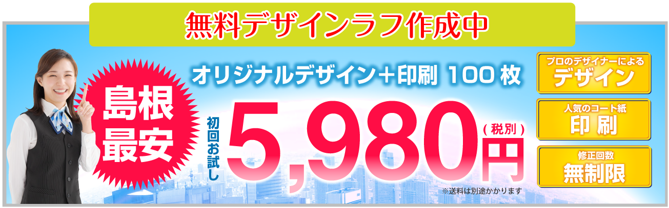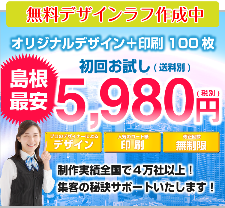 チラシデザイン+印刷で、税抜5980円島根県下最安値に挑戦!!チラシお急ぎ納期OK最短納期当日仕上げ対応中!! 島根県下同業他社より1円でも高い場合はご相談ください!!誠心誠意対応させて頂きます。チラシのことなら島根チラシ作成.com!