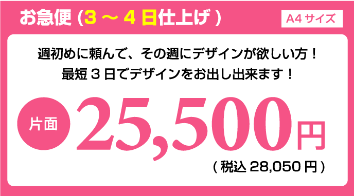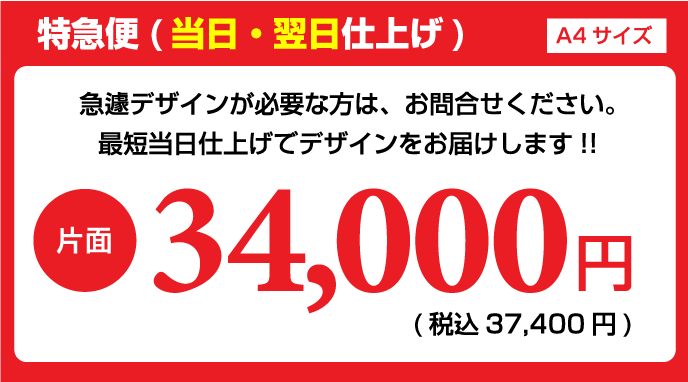 チラシデザイン作成、制作の強み 弊社の一番の強みは、低価格でハイクオリティーなチラシデザインの作成です。一般的な地元島根のデザイン会社ですと、チラシデザイン代片面で3万~4万が相場だと思います。 確かに安い業者はあるのですが、クオリティー的にプロとは言えないレベルのデザインの作成をし、一万円以下で販売もしている業者もいますが、対応のスピードや作品の質に疑問を感じます。島根チラシ作成.comではデザイナー全員が数年間の実務経験を経験しているデザイナーを多数抱えている為、低価格でのデザイン制作が可能になりました。 制作依頼前にラフデザインをご依頼者様に提出する為、お客様のイメージにより近いチラシのデザインを作成しております。よくお会いしてチラシデザインの打ち合わせをしたいというお客様もいらっしゃいますが、弊社は低価格での提供を考えておりますのでやり取りは、電話やメール、FAXなどで対応しております。また、 修正などもお客様がご納得していただくまで、何度でもチラシデザインの修正を承っております。 続いて、チラシデザインの制作スピードに関しましても、最短で当日・翌日仕上げの特急便、2~3日で完成するお急ぎ便の2種類をご用意しております。 チラシデザインの特急便はA4サイズの場合、片面34000円~でお受けしております。チラシデザインのお急ぎ便は片面25500円~でお受けしております。お急ぎの場合は、是非弊社の担当者までお気軽にお問合せいただければ幸いです。 スピードを求めないのでしたら、弊社で1番のお勧めはチラシ印刷パックをオススメしております。一番安いプランですと、チラシデザイン+印刷でA6サイズ100枚で税抜5980円からオススメしております。A4サイズでの最安パックは、チラシデザイン+印刷+送料込みで100枚で9,100円でお受けしております。 また他に何かわからないことがございましたらなんなりとお気軽にお問合せください。
